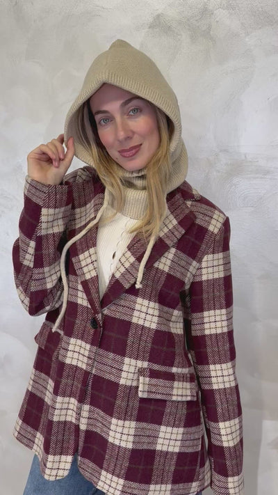 Balaclava in maglia a costine, dal design avvolgente e caldo, perfetta per proteggersi dal freddo con stile. La struttura morbida e flessibile garantisce comfort e copertura, mentre il cordino regolabile permette di adattare la vestibilità in base alle esigenze.