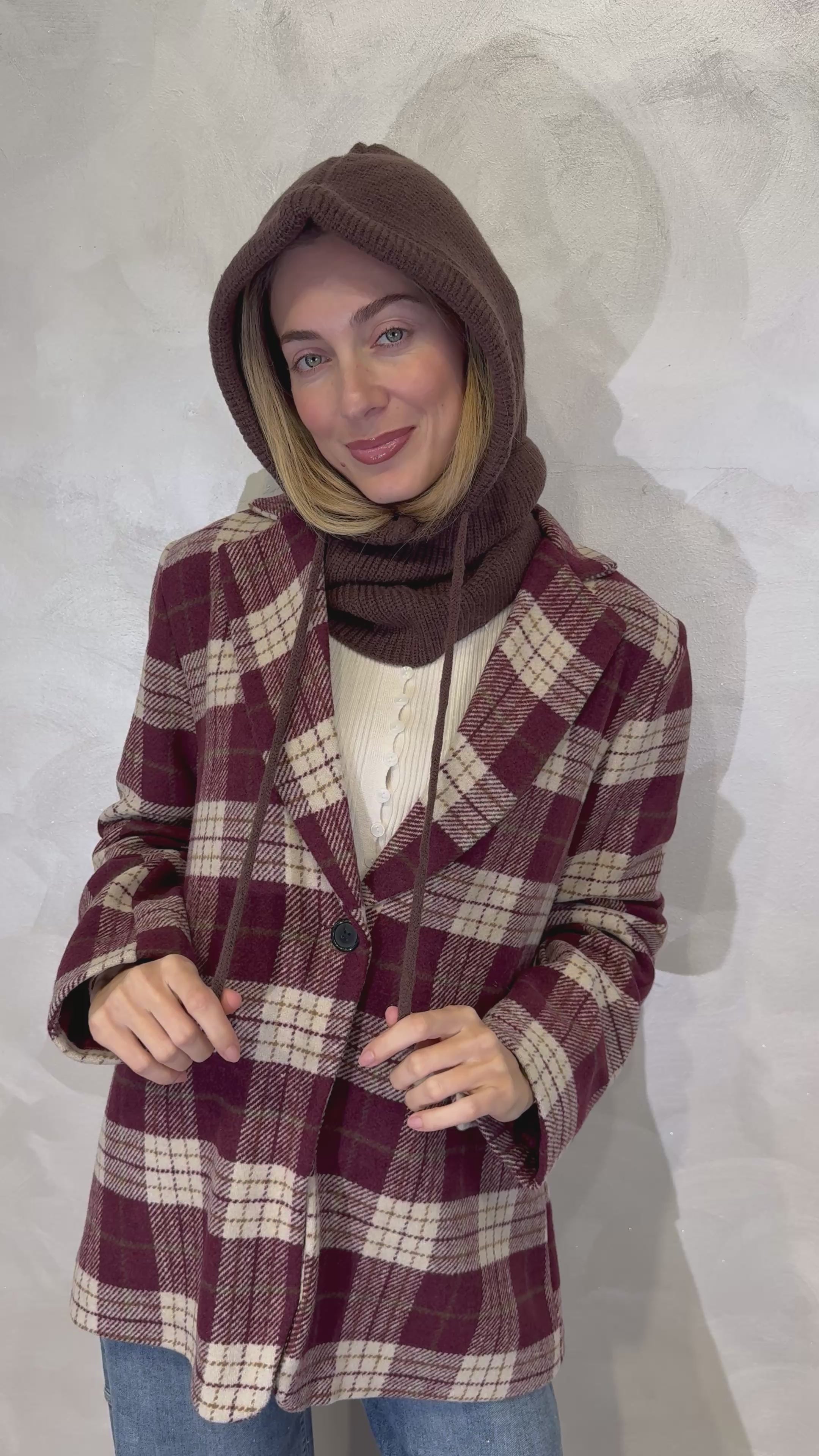 Balaclava in maglia a costine, dal design avvolgente e caldo, perfetta per proteggersi dal freddo con stile. La struttura morbida e flessibile garantisce comfort e copertura, mentre il cordino regolabile permette di adattare la vestibilità in base alle esigenze.