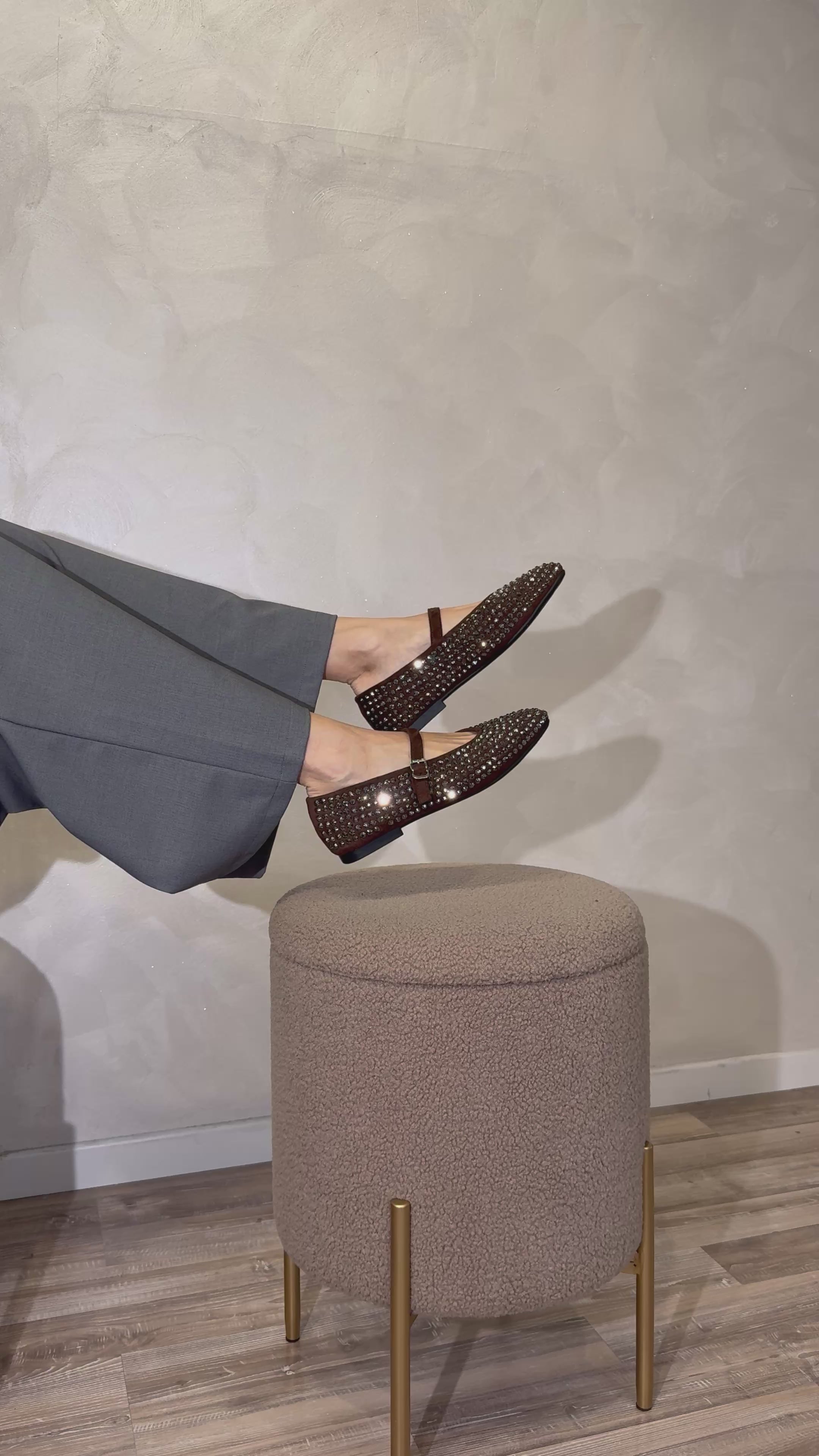 Ballerine con borchie luminose e cinturino regolabile. Eleganza giocosa e dettagli scintillanti.