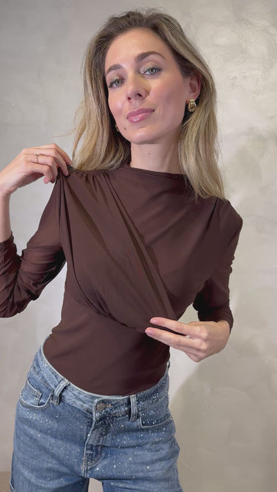 Body a manica lunga in tessuto tulle unito, con collo alto e delicato drappeggio frontale.
