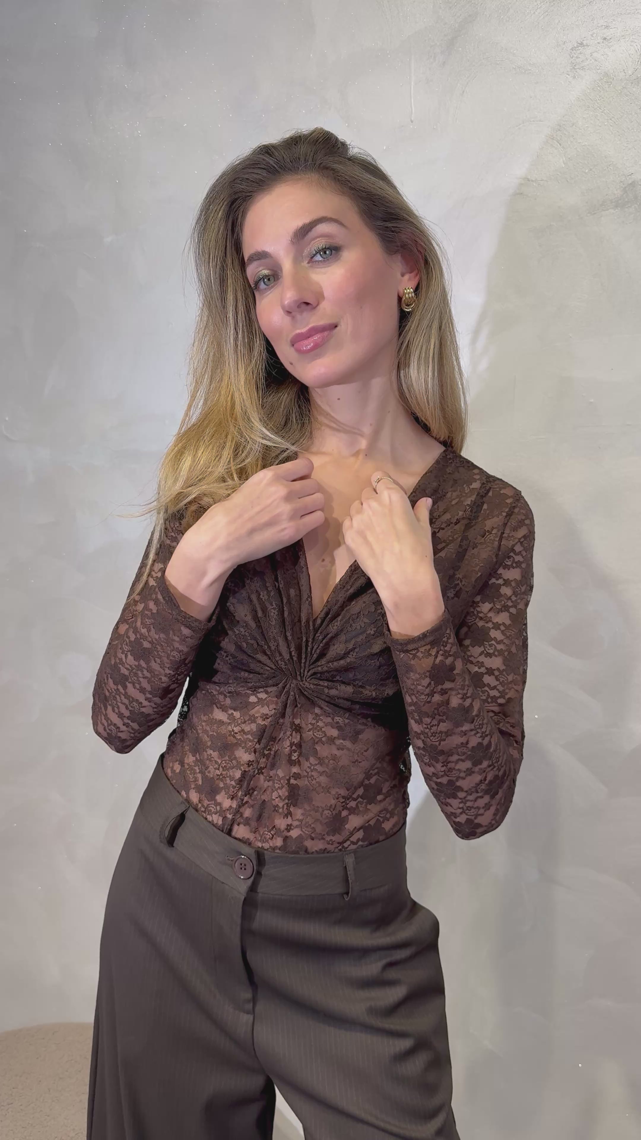 Pizzo leggero e raffinato, twist centrale e scollo profondo per un effetto sensuale ma elegante.