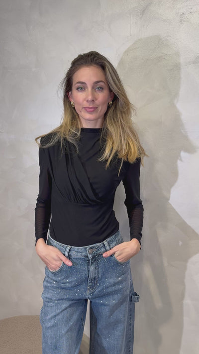 Body a manica lunga in tessuto tulle unito, con collo alto e delicato drappeggio frontale.