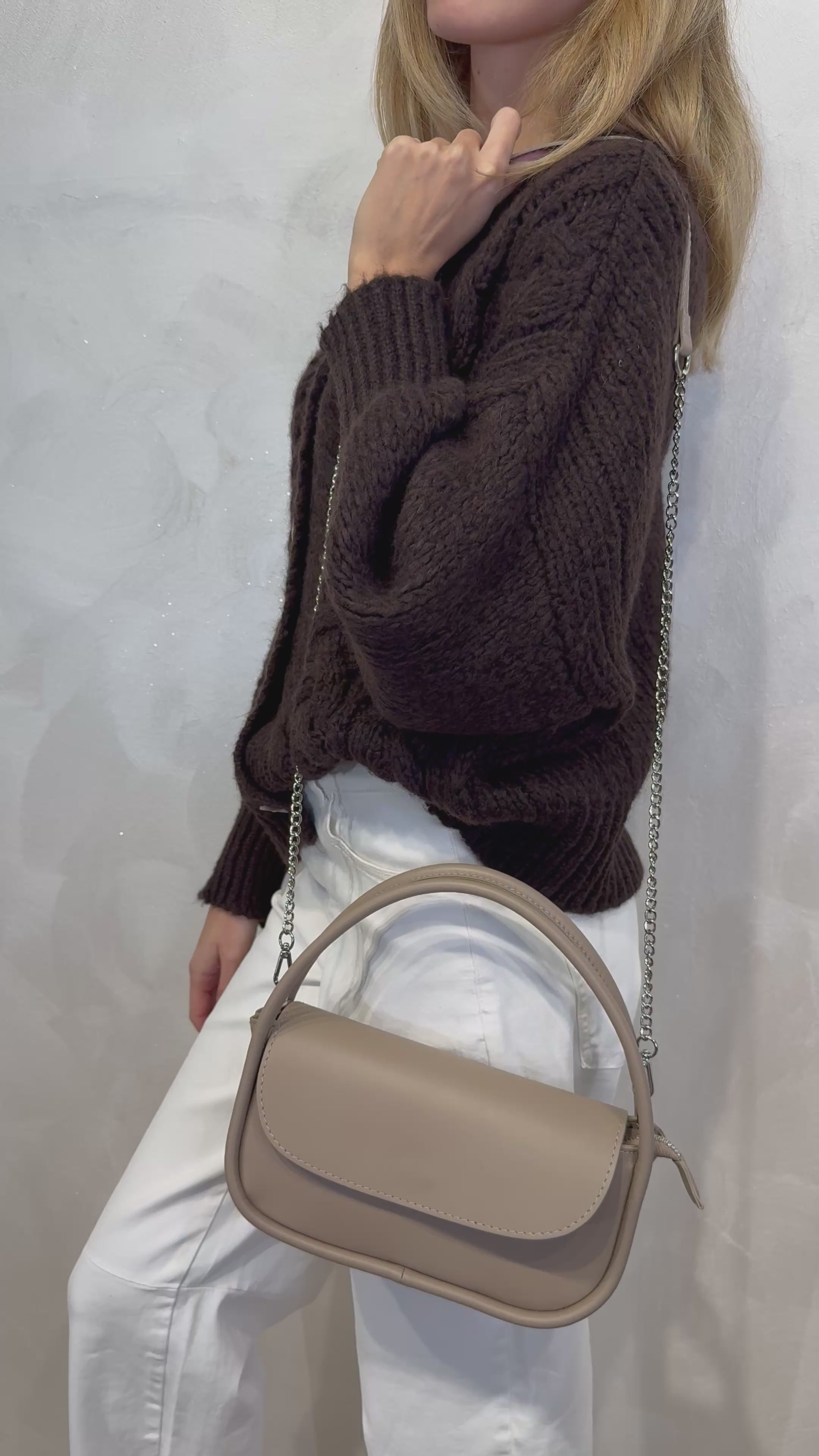 Borsa in vera pelle dal design essenziale e raffinato, perfetta per completare look quotidiani con un tocco elegante. La forma compatta e arrotondata la rende pratica e versatile, mentre la tracolla a catena aggiunge un dettaglio moderno e luminoso.