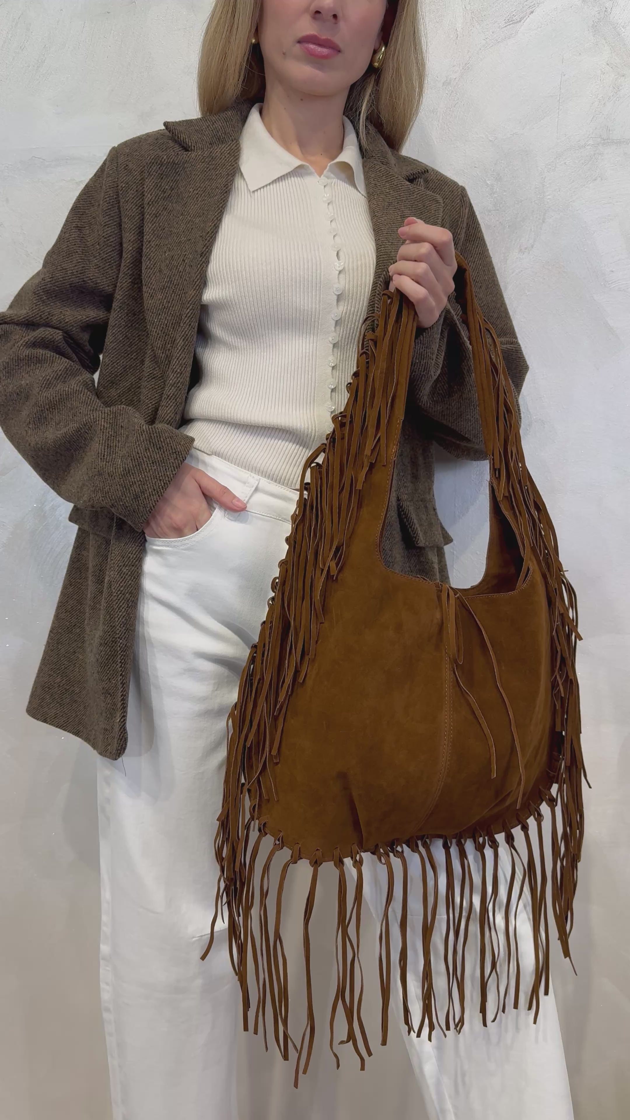 Dettagli: Superficie in eco camoscio, frange laterali in tono, cuciture visibili, proporzioni generose, texture vellutata.