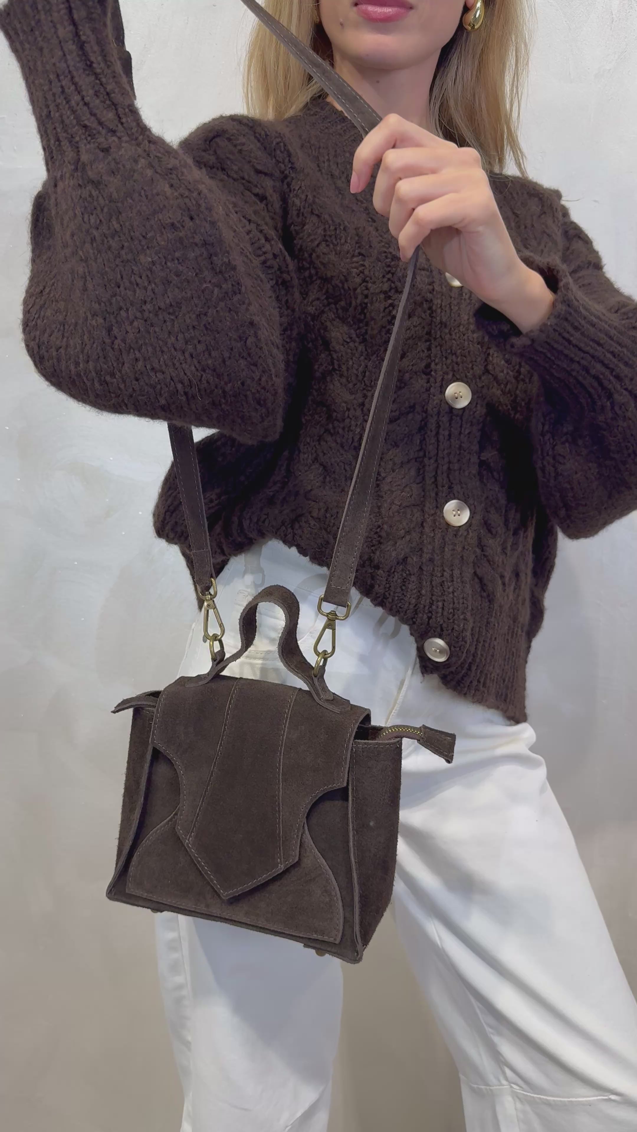 Dettagli: Camoscio con texture naturale, cuciture simmetriche a rilievo, finiture pulite, proporzioni compatte, manico rigido tono su tono.
