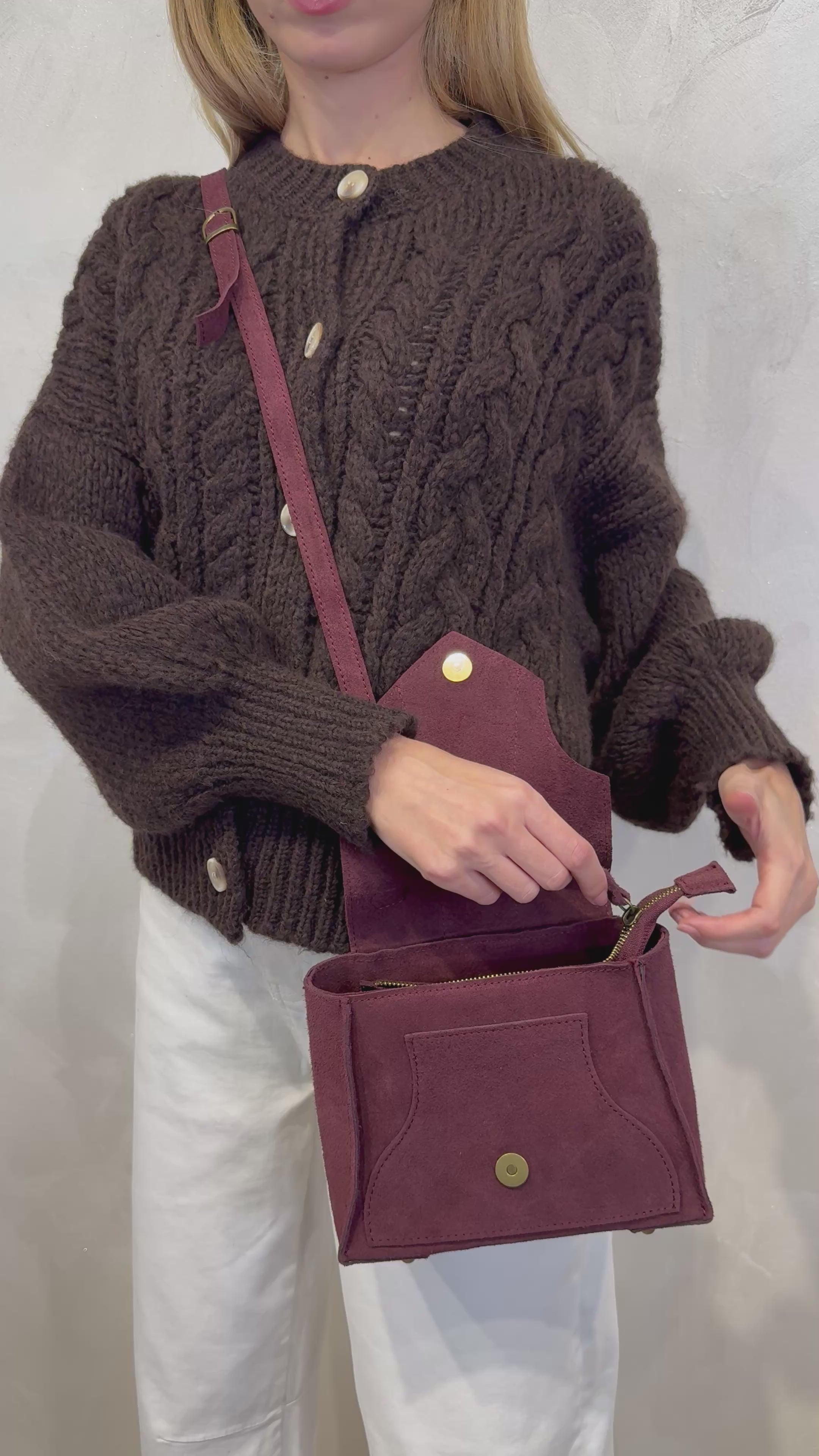 Dettagli: Camoscio con texture naturale, cuciture simmetriche a rilievo, finiture pulite, proporzioni compatte, manico rigido tono su tono.