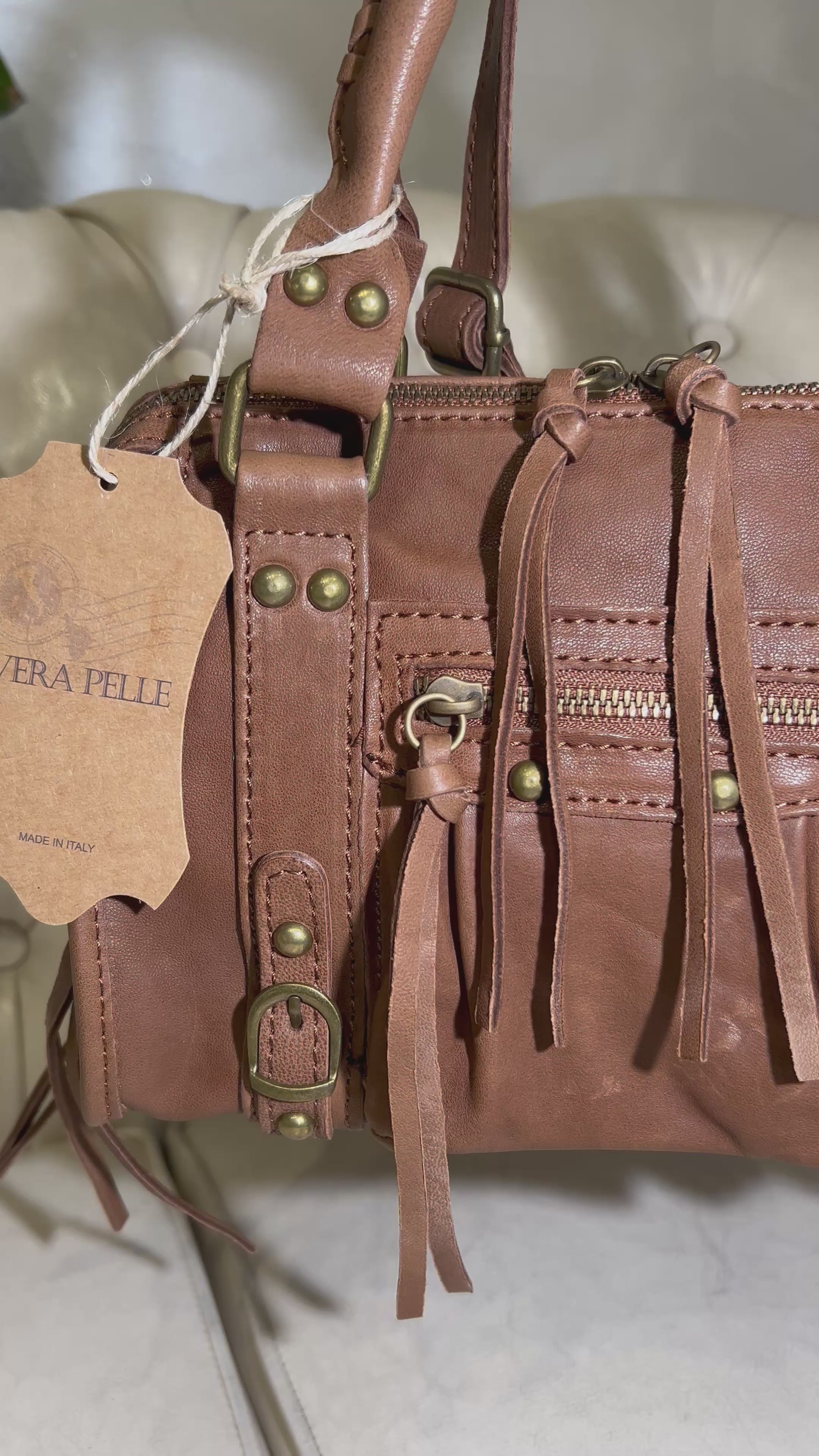 BORSA IN VERA PELLE CON ZIP E DETTAGLI METALLICI COL.CUOIO