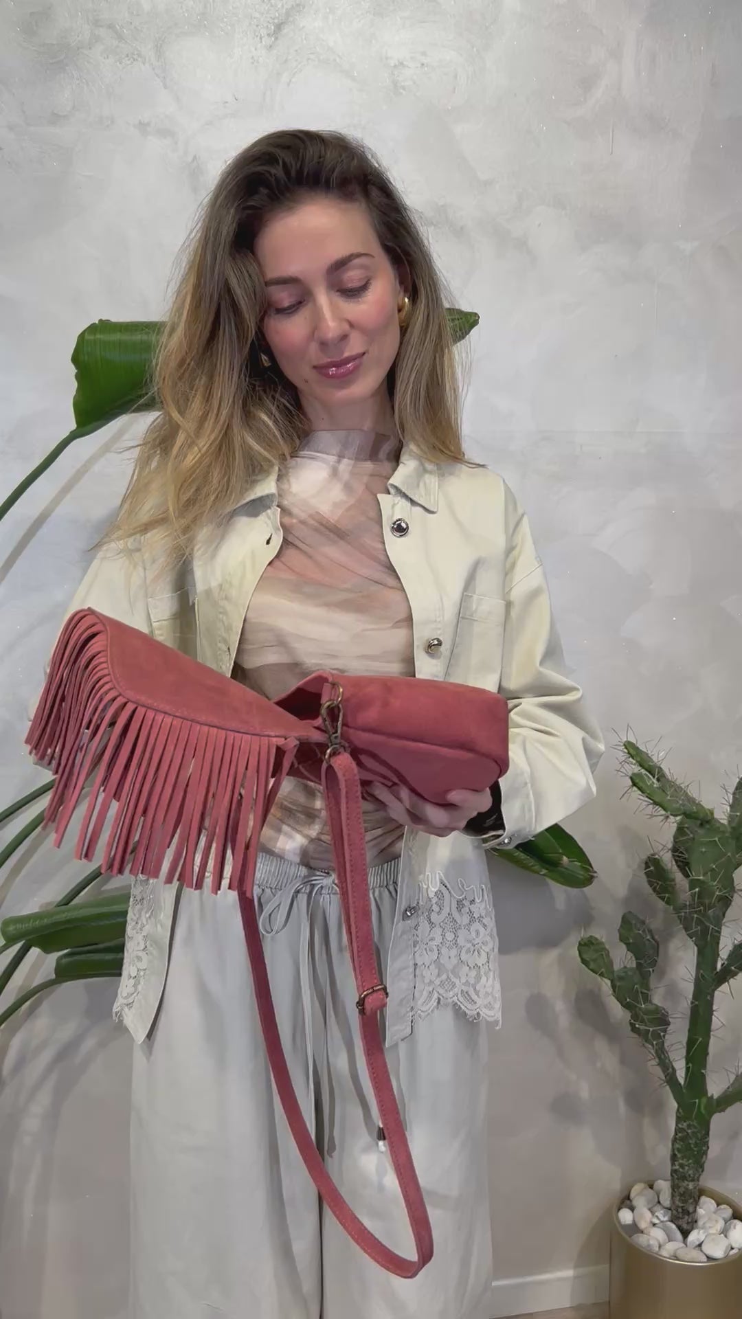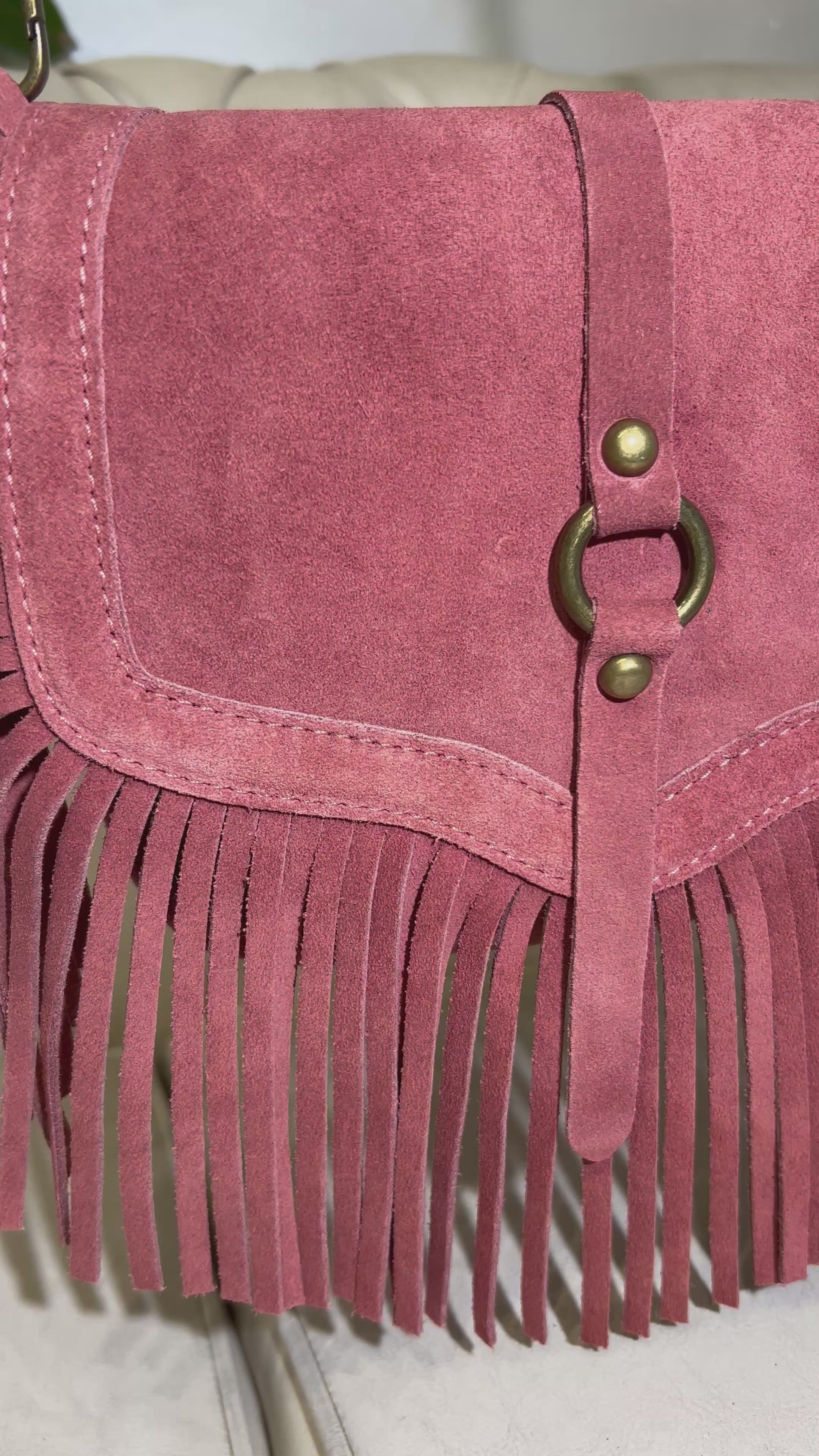 Pelle scamosciata dalla mano morbida, frange lunghe che definiscono l’estetica boho, anello centrale con rivetti metallici, cuciture pulite e costruzione curata.