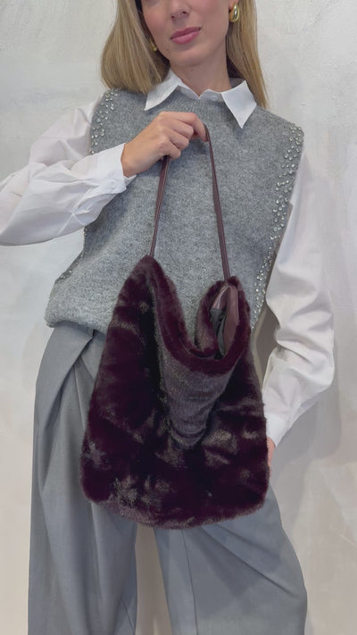 Dettagli: Eco Pelliccia, finitura plush, tracolla in pelle tono su tono, proporzioni compatte, chiusura superiore nascosta.
