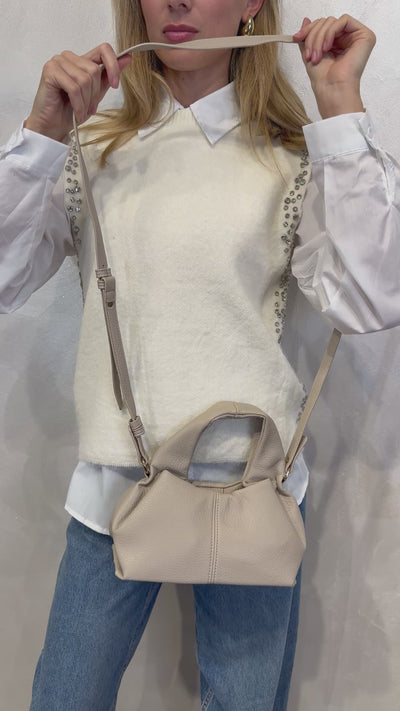 Borsa compatta in ecopelle con texture a grana e finiture dorate. Eleganza decisa e funzionale.