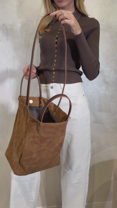 Borsa in vera pelle scamosciata , dal design morbido e naturale, perfetta per look casual e rilassati. La forma destrutturata e i manici lunghi in pelle liscia la rendono pratica e versatile, mentre i dettagli in metallo aggiungono un tocco moderno e funzionale.