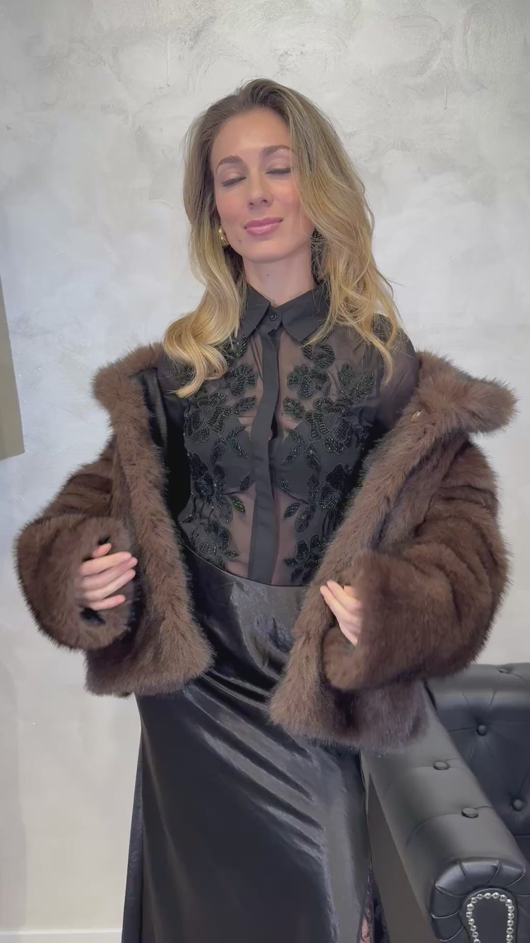 Camicia Body nero con maniche lunghe e colletto, impreziosito da ricami floreali e perline su tulle trasparente. Il pannello centrale opaco crea un elegante contrasto, per un look deciso e raffinato.