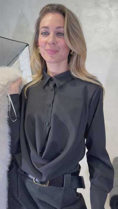 Blusa nera con drappeggio frontale, dal design elegante e fluido, perfetta per completare outfit formali o da ufficio. Il tessuto leggermente lucido dona raffinatezza al capo, mentre il colletto a punta e i polsini con bottoni aggiungono un tocco sartoriale. Il taglio morbido valorizza la figura con discrezione e stile.