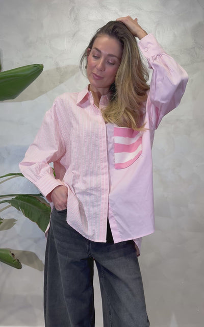 Camicia patchwork in rosa chiaro costruita con pannelli a righe e parti unite, per un effetto grafico moderno e luminoso. Il mix di righe verticali, orizzontali e sezioni lisce crea un equilibrio asimmetrico raffinato e distintivo.