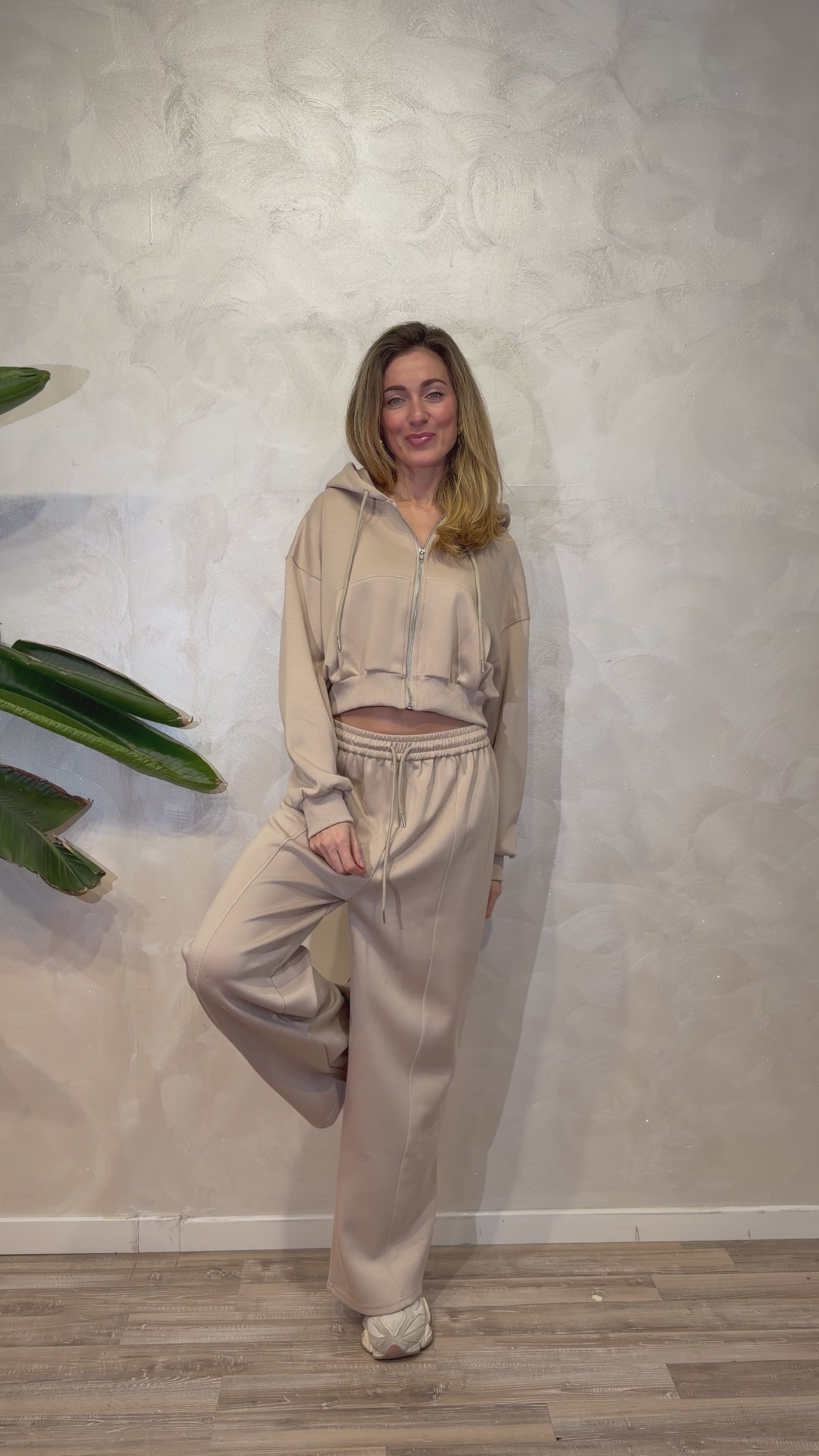 sabbiaCoordinato in morbida felpa con zip frontale e taglio rilassato. La felpa cropped e i pantaloni a gamba larga creano un look moderno e confortevole. Ideale per outfit casual dal carattere contemporaneo.