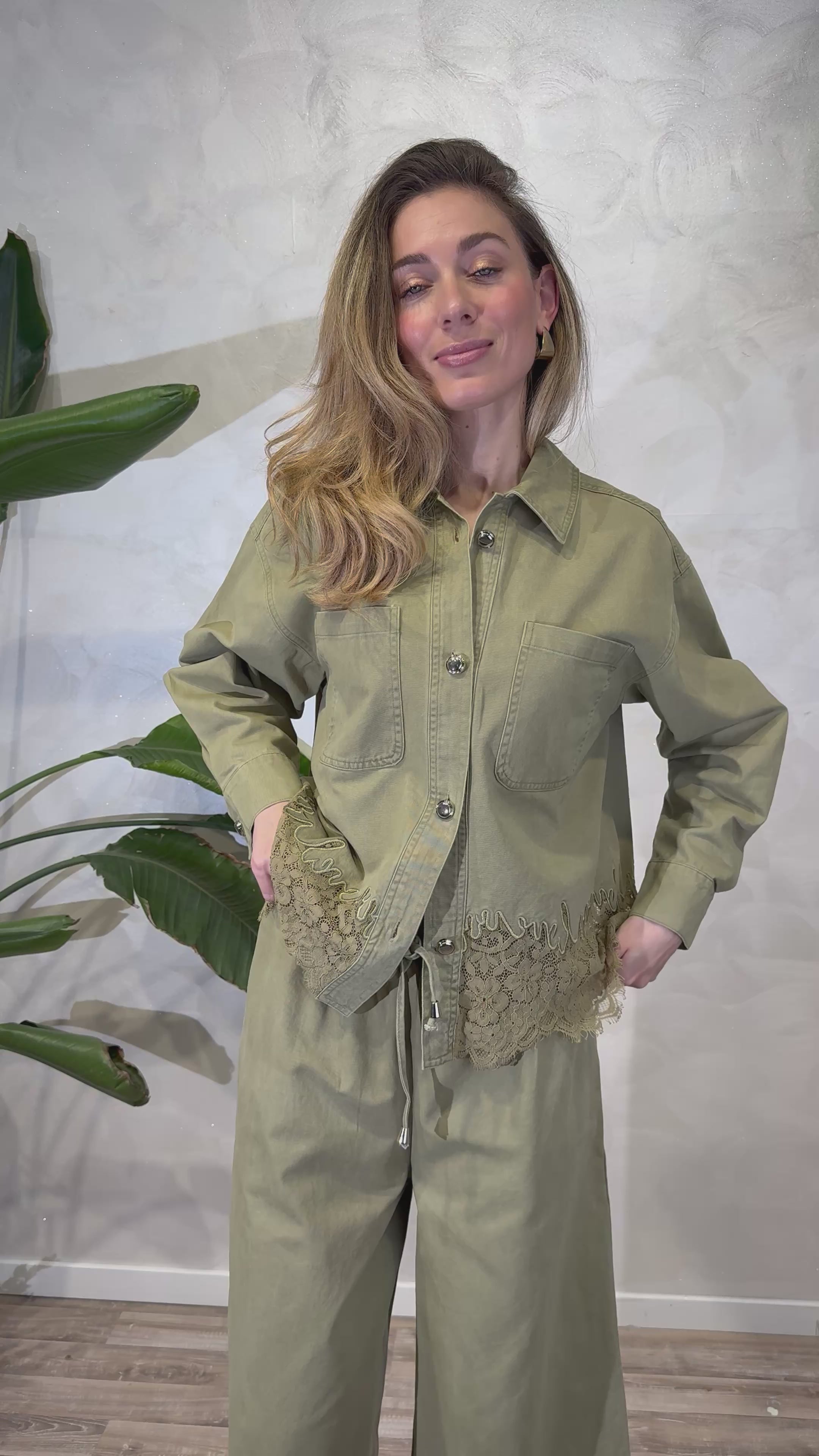 verde olivaCamicia‑giacca in tonalità verde oliva con linea dritta e dettagli utility, impreziosita dall’inserto in pizzo sul fondo che aggiunge un tocco femminile e ricercato. Un capo versatile, perfetto sia come top che come sovracamicia leggera.