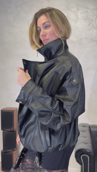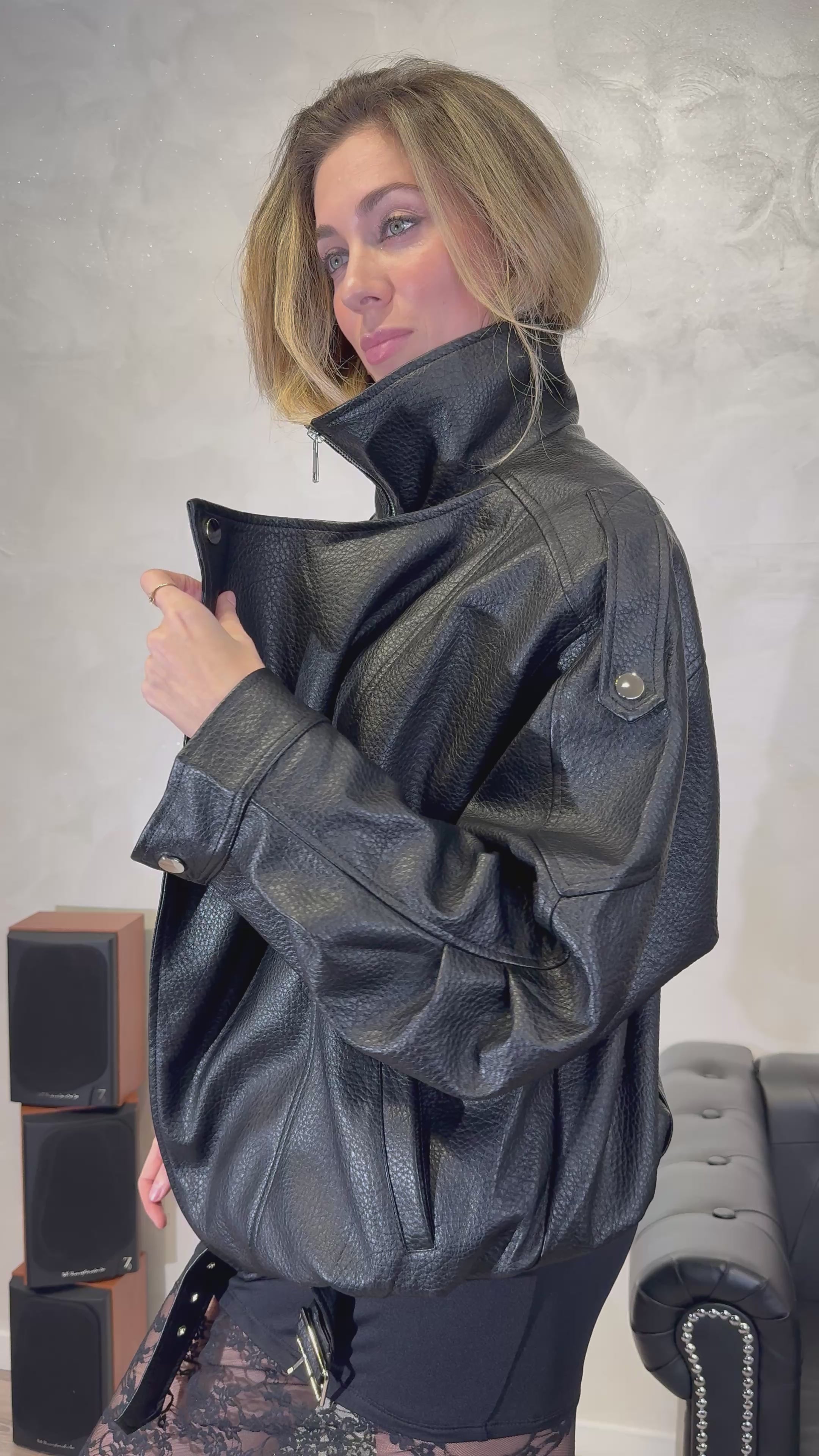 Giubbotto in ecopelle nera, fit oversize, tipo modello chiodo, Collo alto, zip frontale, dettagli con bottoni a pressione e cintura sul fondo. Stile urbano deciso e versatile.