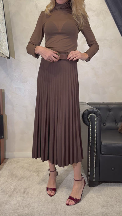 Gonna plissettata con cintura marrone coordinata. Il design elegante e il dettaglio della fibbia dorata donano un tocco sofisticato e moderno, perfetta per look versatili.