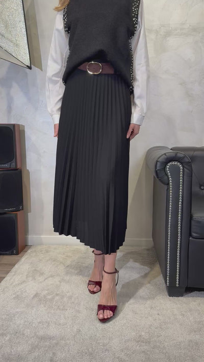 Gonna plissettata con cintura marrone coordinata. Il design elegante e il dettaglio della fibbia dorata donano un tocco sofisticato e moderno, perfetta per look versatili.