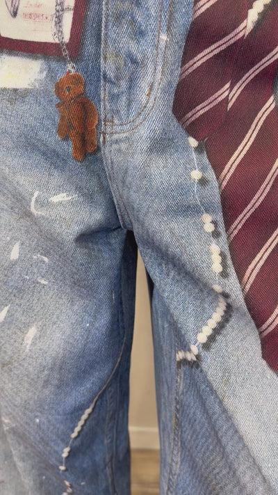 Cintura stampata direttamente sul denim, applicazioni grafiche e inserti decorativi che rendono il modello unico; lavaggio blu vissuto che esalta la costruzione e i contrasti.