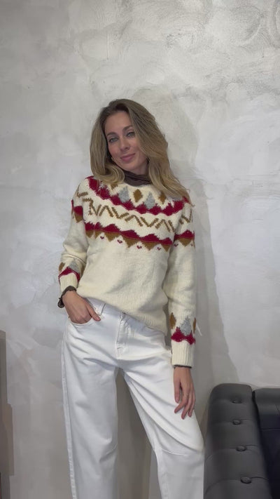 Maglione in maglia panna con motivo geometrico Norvegese multicolore. Taglio regular, collo tondo, polsini e fondo a costine. Stile folk contemporaneo, caldo e originale.