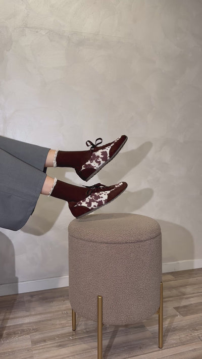 Sneaker con stampa muccata marrone e bianca, suola tono su tono e dettagli dorati. Stile audace e originale.