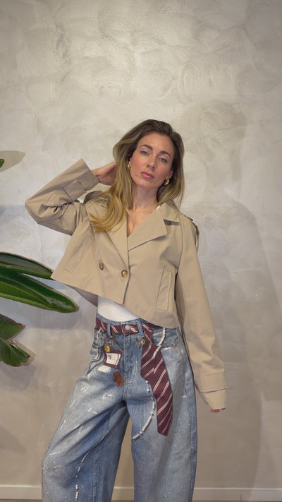 Trench corto in gabardine leggera con costruzione sartoriale e dettagli ispirati al trench classico.
